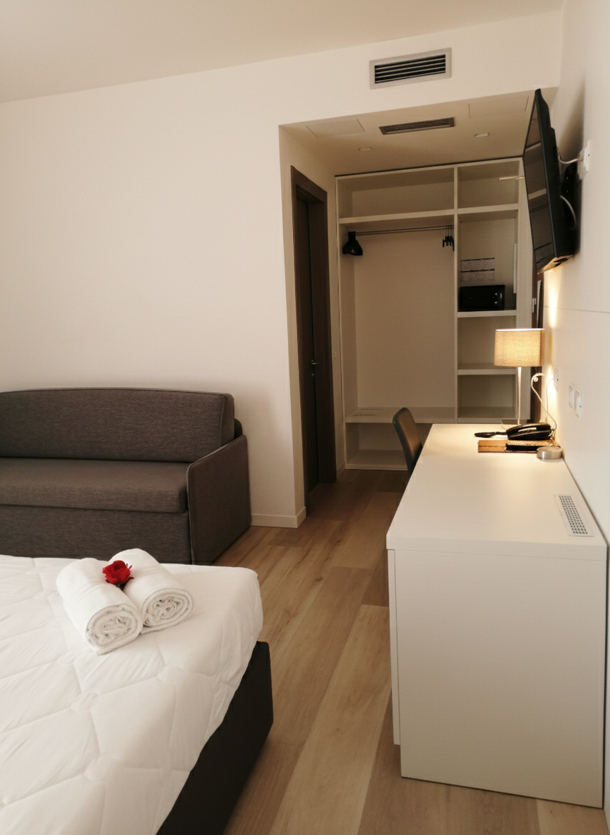 Modernes und geräumiges Zimmer (ca. 26 m2) mit seitlichem Meerblick. Perfekt zum Entspannen nach einem Tag am Strand. WLAN, TV, Klimaanlage… alles, was Sie zum Abschalten brauchen.